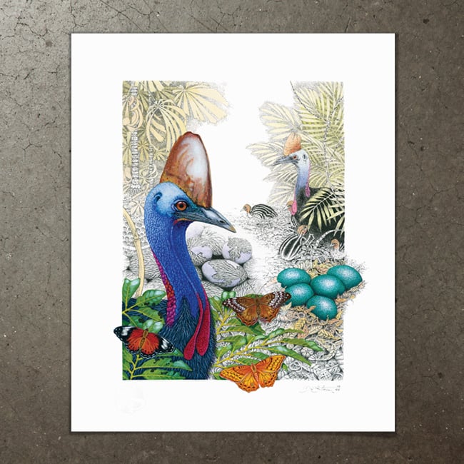 This work consists of Cassowary chicks and eggs. Male and female Cruiser Butterflies, Red Lace Wing and Cassowary Plums. Much work is being done to conserve the habitat of these rare flightless birds. The Cassowary are endangered of becoming extinct unless we wake up to ourselves and take extra care to protect them and their environment.
